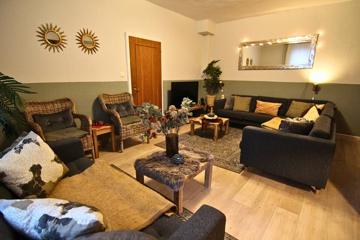 The 9 bedrooms are spread over four floors and accommodate 18–20 guests in total. Some rooms offer extra comfort such as a small seating area or access to a balcony. This gives everyone plenty of privacy, while the shared spaces make it easy to spend time together.